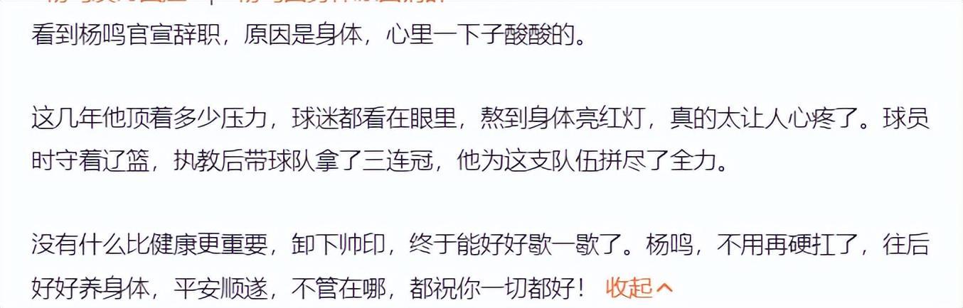 不希望杨鸣指导离职,他应该带10多年才好,他已经证明过自己的实力,有好阵容就可以夺冠。