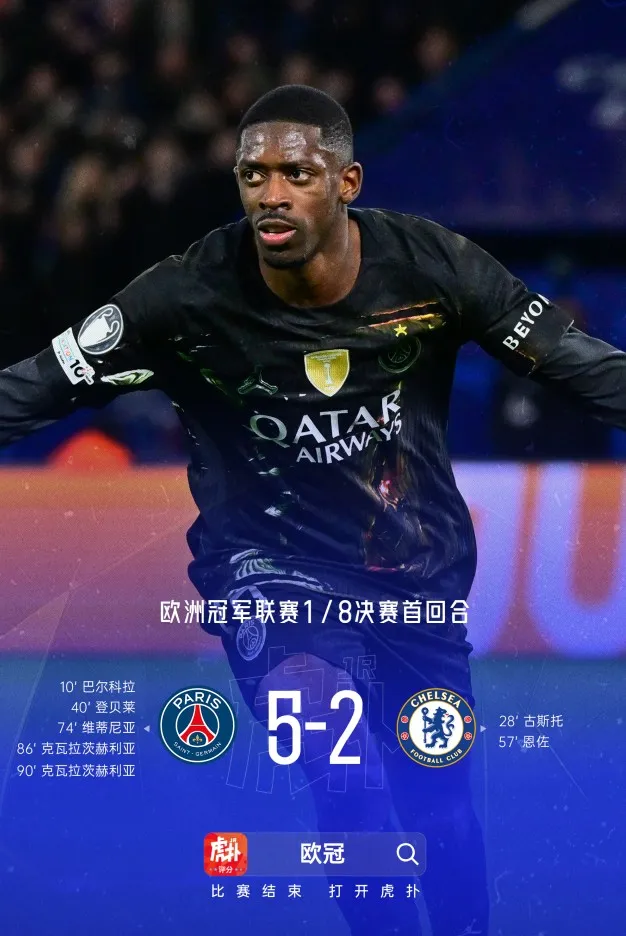 虎扑03月11日讯 欧冠1/8决赛,巴黎主场5-2切尔西,克瓦拉茨赫利亚替补2球1助。